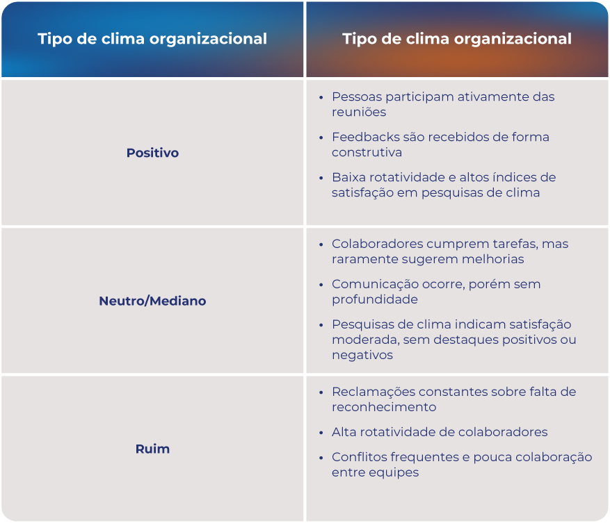 O clima organizacional pode assumir diferentes formas, de acordo com a forma como a empresa se relaciona com seus colaboradores e como estes percebem o ambiente de trabalho. Entre os principais tipos, destacam-se: