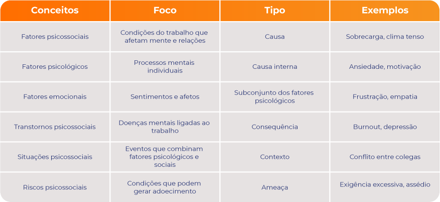 No contexto da saúde ocupacional, esses fatores estão ligados às experiências emocionais e sociais vividas no trabalho que podem contribuir para um ambiente saudável e produtivo, ou gerar sofrimento e adoecimento psicológico.