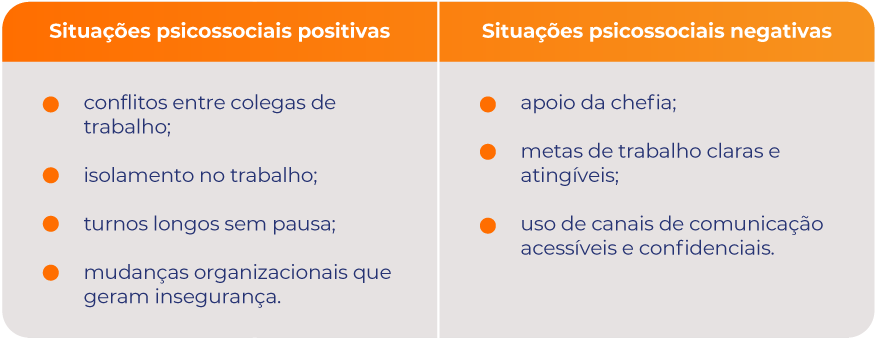 De acordo com a Fundacentro, os fatores psicossociais se apresentam em 3 frentes no contexto ocupacional: