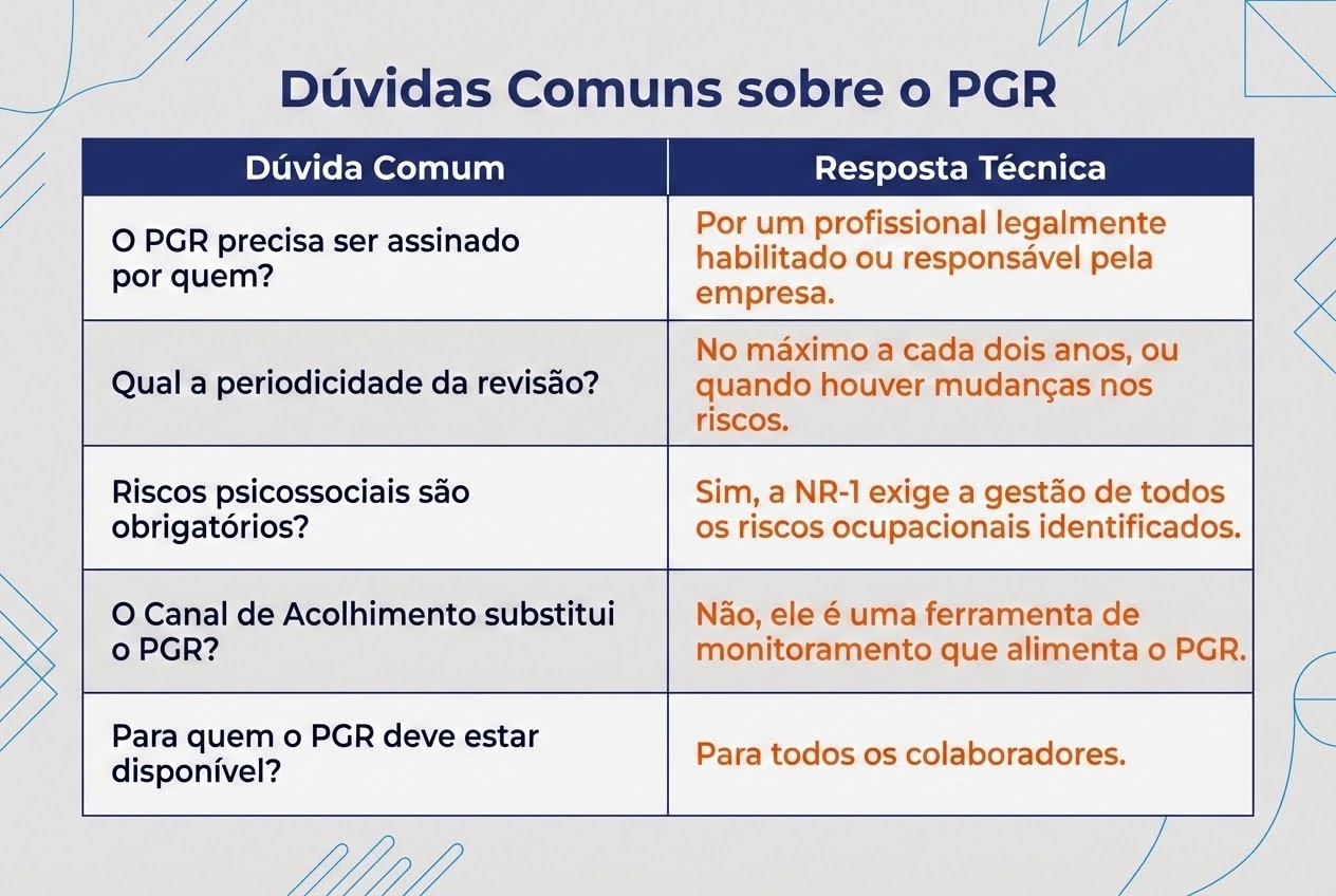 Se a empresa tiver histórico de afastamentos por saúde mental ou denúncias de assédio, e o PGR não mencionar esses riscos, o documento pode ser considerado inconsistente. Isso gera multas e pode levar à impugnação do programa de segurança.