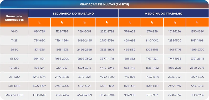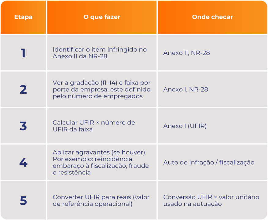O Anexo II da NR-28 indica o item infringido, enquanto o Anexo I traz a gradação/valor em UFIR, que, depois das análises, é então convertida para reais (R$) para se obter o valor final.