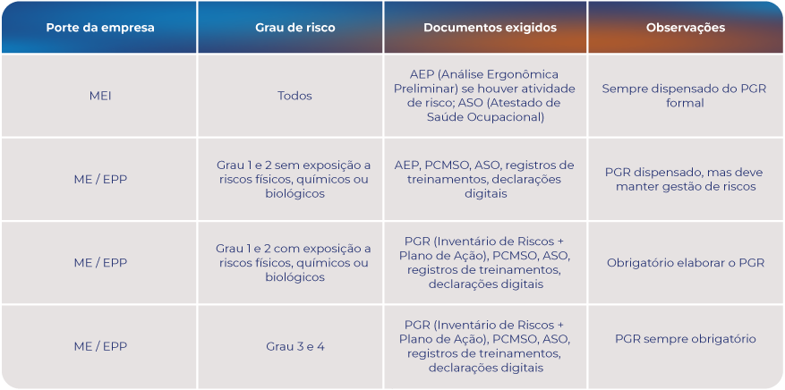 • A dispensa para ME e EPP só ocorre quando o CNAE da empresa for de grau de risco 1 ou 2 e não houver exposição a agentes físicos, químicos ou biológicos.