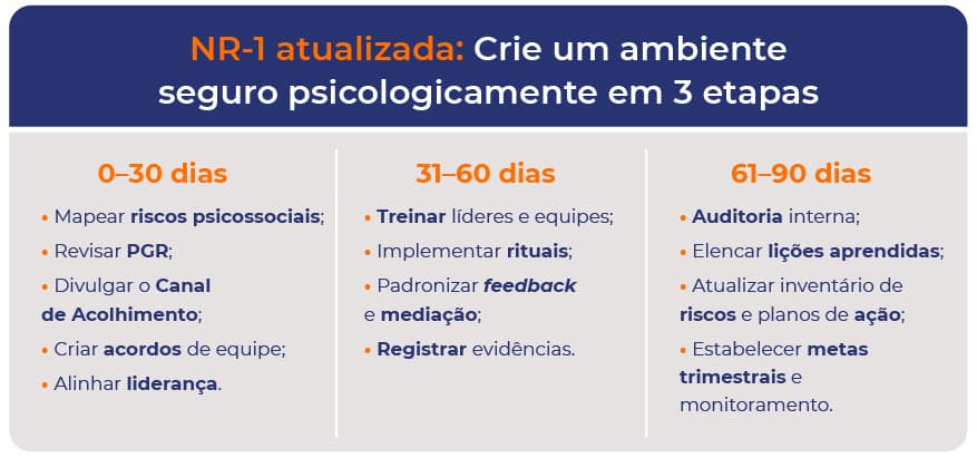 Com as novas portarias (MTE nº 1.419/2024 e nº 765/2025), as empresas têm até 25 de maio de 2026 para se adequar à NR-1 atualizada. Um período ideal para rever políticas internas e desenvolver cultura, processos e canais de escuta seguros para os trabalhadores.