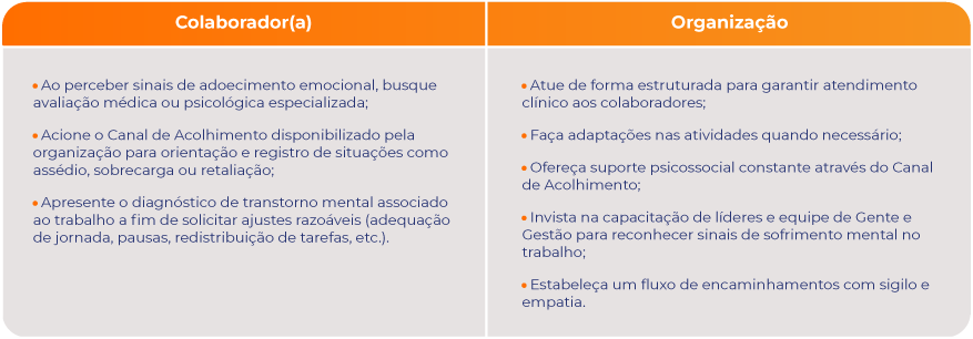 Tanto a pessoa trabalhadora quanto a organização têm responsabilidades complementares nesse processo. Na tabela abaixo, veja como isso pode funcionar na prática!
